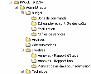 Il s'agit d'adopter une structure commune pour tous les dossiers de projet. C'est vraiment la base d'une bonne organisation documentaire puisque cela permet de regrouper les divers éléments d’un dossier par types de contenu de façon normalisés. À l'usage, le gain de temps et de clarté est inestimable.